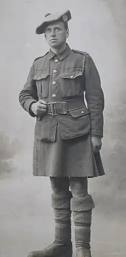 After war was declared, he initially volunteered for the Royal Flying Corps, but transferred to the London Scottish. After training he was initially posted to the 1st Battalion in France, where he was wounded at the Battle of the Somme in September 1916 at Leuze Wood.