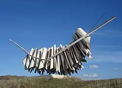 "White Rhythm" stands on a dune at Wijk aan Zee in the Netherlands. Erskine in 1999 represented Great Britain at the European Capital of Culture Sculpture Symposium "Sea and Steel", Britain being one of twelve countries hosted by the Netherlands. "White Rhythm" was awarded first prize by Queen Beatrix. The stainless steel sculpture measuring 8 by 12 metres (26 by 39 ft), installed in 2000, is made of shapes cut out of sheet metal, and is an abstract representation of a crowd of people moving in a busy street.[1][5][6]