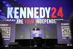 On September 29, 2023, Mediaite reported that Kennedy was reorienting his campaign to run as an independent rather than as a Democrat.[62] On October 9, 2023, he confirmed these reports by formally announcing that he would be continuing his presidential bid as an independent candidate. The announcement took place at an event held in Philadelphia.[63] In his announcement speech, Kennedy criticized the Democratic and Republican parties for functioning as a "uniparty".[64]