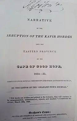 - A Narrative of the Irruption of the Kafir Hordes Into the Eastern Province of the Cape of Good Hope, 1834-35: Compiled from Official Documents and Other Authentic Sources. Meurant and Godlonton. 1836.