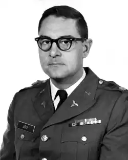 After completing the Armed Forces Staff College, Joy was assigned to the Medical Research Division of the Office of the Army Surgeon General, where he would serve for the next 18 months.[30] This was a time of great import for the research enterprise in the AMEDD, where a major portion of the Departments $51.4 million research program was devoted to solving specific problems relevant to ongoing operations in the Republic of Vietnam. It was also a period that saw the Medical Unit, Self-contained, Transportable (MUST) hospital equipment set, originally approved for use in Vietnam, certified for worldwide deployment in the full range of operational environments, and the approval of a major research and development construction program which would have consolidated Army Medical R&D facilities from 13 sites to six, while increasing the Army's in-house medical research capability by some 40%.[31][32]