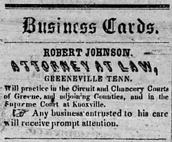 Robert Johnson, called Bob, was born in the family's Water Street house in Greeneville, the county seat of Greene County, Tennessee.[1] He is said to have briefly studied at Franklin College in Nashville during the winter of 1850–51,[2] but within short order returned home "for unknown reasons."[3] During this time period he also apparently experienced some hemorrhaging of the lungs, possibly consequent to a tuberculosis infection.[2] Johnson was a lawyer by profession,[4] first licensed in 1856, having studied under an attorney named Robert McFarland.[2] However, according to one contemporary newspaper account of his life, he was "never distinguished by his father's strong characteristics" in this profession.[5] Robert and his brother Charles Johnson also managed their father's business affairs and real estate when Andrew Johnson was away from Tennessee.[6] Early in his life, Robert Johnson had "seemed to be a responsible young adult, one upon whom his father depended for a variety of things."[2] He attended the 1856 Democratic National Convention.[6]