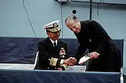 On August 27, 1988,[10] Kihune assumed command of the Naval Surface Force, U.S. Pacific Fleet. In January 1991, he became Assistant Chief of Naval Operations for Surface Warfare. In August 1992, Kihune became director of Naval Training and Doctrine and chief of Naval Education and Training.[1] In 1993, while serving in this capacity, Kihune was involved in a congressional dispute regarding the Navy's Undergraduate Helicopter Pilot Training (UHPT) program, where he was accused of leaking the Navy's position of retaining the program by lawmakers to delay its consolidation with the Army's equivalent, defying the wishes of Secretary of Defense Les Aspin.[11]