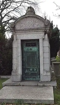 He is interred in Kensal Green Cemetery, in Grade II listed portland stone with bronze door mausoleum.[10]