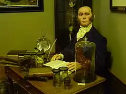 He turned his sharp wit on the elders and the clergy of the city, satirising religion and delighting his students. Knox routinely referred to the Bridgewater Treatises as the "bilgewater treatises" and his 'continental' lectures were not for the squeamish. John James Audubon was in Edinburgh at the time to find subscribers for his Birds of America. Shown round the dissecting theatre by Knox, "dressed in an overgown and with bloody fingers", Audubon reported that "The sights were extremely disagreeable, many of them shocking beyond all I ever thought could be. I was glad to leave this charnel house and breathe again the salubrious atmosphere of the streets".[20] Knox's school flourished and he took on three assistants, Alexander Miller, Thomas Wharton Jones and William Fergusson.
