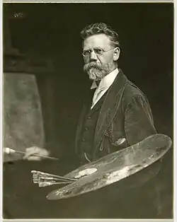 Koehler was president of the Minnesota State Art Commission from 1903 to 1910, member of the Artists' League of Minneapolis, honorary member of the Minnesota State Art Society, honorary member of the Alumni Association of the Minneapolis School of Art, member of the Society of Western Artists, a lecturer on art history at the University of Minnesota, and member of the Institute des Beaux Arts et des Lettres of Paris, France. He received bronze and silver medals at the Munich Academy, honorable mention at the Paris World's Fair, 1889, bronze medal at the International Art Exhibition at Buenos Aires in 1910, and the cross of the Order of Saint Michael of Bavaria in 1888.[2] Three notable paintings, "The Carpenter's Family," "At the Cafe," and his masterpiece "The Strike" were selected for display at the Columbian Exposition in Chicago in 1893.
