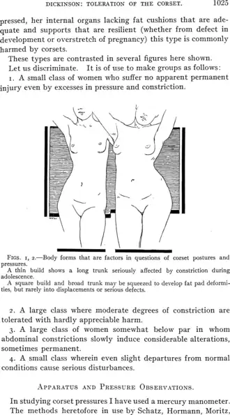 In 1910, Dickinson published "Toleration of the corset: Prescribing where one cannot proscribe", in which he investigated the medical effects of corsets, including the displacement and deformation of internal organs. He found that, while some women could wear these garments without evident damage, the vast majority of users sustained permanent deformations and damage to their health.[4]