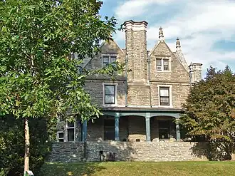This historic structure was built in 1896 and is a 2+12-story, rectangular, stone dwelling that was designed in the Jacobean revival style. It features two-story projecting bays with leaded glass windows, soaring cross gables and dormers, and pointed arch openings. Also located on the property is a contributing stable/carriage house and a free-standing, stone fireplace. It housed the Philadelphia School of Criminology from the late-1940s to 1963, then housed Combs School of Music until 1983.[2]