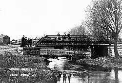 A Protestant church and cemetery, was founded in 1846. A wooden bridge was built over Buffalo Creek in the late 1800s to connect a commerce district with the Protestant church.[4] By the end of the nineteenth century, the expansion of the crossroads on the other side (becoming home to multiple businesses and a town hall) and the rise of the automobile introduced the need for a new, sturdier bridge. In response, the bridge that exists today was built in 1906 by the Joliet Bridge and Iron Company,[2]: 7,8 [4] and it became known as the Buffalo Creek Bridge.[8]