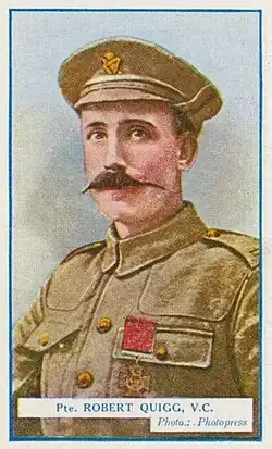 Robert Quigg VC (28 February 1885 – 14 May 1955) was an Irish recipient of the Victoria Cross, the highest and most prestigious award for gallantry in the face of the enemy that can be awarded to British and Commonwealth forces. The award was made for his actions during the Battle of the Somme in the First World War.