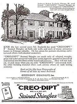 During his career, Seyfarth's work appeared in magazines and journals and in the advertisements of various architectural supply firms. The extent to which this was done is not entirely known, but articles by Eleanor Jewett (1892–1968), art critic for the Chicago Tribune ("Cape Cod Architecture seen in B.L.T.'s Home" discussing the Taylor house at 92 Dell Place in Glencoe, Illinois) and Herbert Croly of the Architectural Record ("The Local Feeling in Western Country Houses", October, 1914, which discusses the Kozminski and McBride houses in Highland Park at 521 Sheridan Road and 2130 Linden, respectively) survive to give us some idea of how Seyfarth's work was received during the time he was practicing. (Croly would later go on to become the founding editor of The New Republic magazine.[113]) Additionally, photographs of houses he designed appeared in The Western Architect magazine a number of times in the 1920s. Also surviving are copies of advertisements from the Arkansas Soft Pine Bureau (see image, right), the California Redwood Association (again with the McBride House), the Pacific Lumber Company (featuring the Churchill house in Highland Park at 1375 Sheridan Road), The Creo-Dipt Company (see image, left), the White Pine Bureau, the American Face Brick Association and the Stewart Iron Works Company of Cincinnati (with a picture of the H. C. Dickinson house at 7150 S. Yale in Chicago). In 1908, his Prairie-style house for Dickinson was published in House Beautiful magazine.[98] In 1918,[114] the Arkansas Soft Pine Bureau released a 32 page portfolio featuring houses built from Seyfarth's designs. Included were photographs, floor plans, bills of material, an estimate of the costs, and a brief description of important features. Entitled The Home You Longed For, the booklet was announced in Building Age Magazine under the heading "New Catalogs of Interest to the Trade".[115] Although generally unavailable today, it must have enjoyed a wide circulation in its time. It was acquired the following year for the collection of the Carnegie Library of Pittsburgh,[116] and referred to that same year in an illustrated article that appeared in Printers' Ink Monthly[117] entitled "The Loose-Leaf Portfolio - an Aid to Reader Interest", where it was described as "...a very attractive loose-leaf portfolio" and as a successful example of its type of publication.[118]