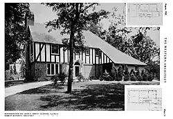 In 1911 Robert Seyfarth designed and built a gambrel roofed Shingle Style house for his family on Sheridan Road in Highland Park,[95] across the street from Frank Lloyd Wright's Ward Willets house (1901), and it marked a change in the direction of his design work - for the rest of his career his would design in an eclectic style combining Colonial Revival, Tudor and Continental Provincial elements with strong geometric forms.[96] During his career Seyfarth would design 73 houses in Highland Park alone, where his output began before the time of his arrival as a resident and lasted until shortly before his death. Here he elected to ignore the notion that in later years was famously offered to young architects by the Sage of Taliesin "... go as far away as possible from home to build your first buildings. The physician can bury his mistakes—but the Architect can only advise his client to plant vines.".[97] Almost exclusively a residential architect with the majority of his work in the Chicago area, he also designed projects in Michigan, Wisconsin, Ohio, Virginia, Kentucky and Alabama. By the end of his career, he had designed over two hundred houses.[98]