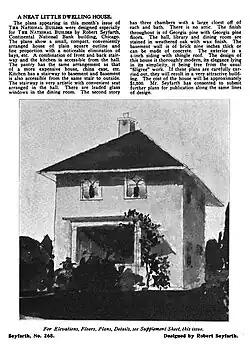 Robert Seyfarth began to offer his services as an independent architect almost immediately after his graduation from Chicago Manual Training School. A late 19th century directory of Blue Island,[90] published while he was most likely still working for the Chicago school board, contained a listing for "Robert Seyfarth, Architect" that showed the Seyfarth building (demolished 1992) as his address. After he began working in Maher's office his independent work began to show the influences of Maher and other Prairie School architects, and his earliest known independently attributed work comes at this time. In 1905 a "Neat Little Dwelling House" was published with plans, bills of material and estimate of costs in the May edition of The National Builder magazine.[91]