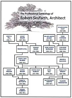 .[58] Seyfarth began his career as an architect at the age of 17 working for Fiedler during the time the latter was architect to the board of education, and records show his position at the time he was hired to be "messenger" (although, as noted above, his graduation notice suggested something more than that), for which he was compensated with a salary of $6.00 per week (about $219.76 in 2023).[59] Fiedler operated out of offices in Adler and Sullivan's Schiller (later Garrick Theater) Building[60] (1891, demolished 1961), and Seyfarth was almost certainly introduced to him through his uncle Henry Biroth, who was one of the earliest pharmacists in Chicago and served at various times as the secretary and president of the Illinois Pharmaceutical Association,[61] which occupied offices down the hall from Fiedler.[62] The Seyfarth family had been acquainted with Fiedler for several years before Seyfarth began to attend Chicago Manual Training School. Henry Biroth was an active member of Chicago's large ethnic German community, and in 1887, Fiedler (with his partner John Addison) had designed a house for him in Blue Island.[63] How long the young Seyfarth worked for Fiedler and the board of education is not known (Fiedler separated from the board of education late in 1896, and was replaced by Normand Patton[64]), but by 1900 he was working for George Washington Maher on the renovation of the interior of the Nickerson mansion for Lucius Fisher. Here, according to the Historic American Buildings Survey, he designed and carved the woodwork for the rare book room.[65]
