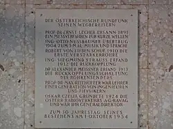 During the interwar period, Lieben was hailed in his native Austria as a leading inventor. Streets were named in his honour (German: Liebenstrasse) in Vienna,[19] Amstetten[29] and Berlin.[30] Lieben was depicted on a 1936 Austrian postage stamp that was designed by Wilhelm Dachauer and Ferdinand Lorber.[31] A memorial to Lieben at the Radio Verkehrs AG building in Vienna was opened in 1927 and destroyed after the Anschluss of 1938.[19]