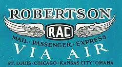 Robertson Aircraft Corporation was a post-World War I American aviation service company based at the Lambert-St. Louis Flying Field near St. Louis, Missouri, that flew passengers and U.S. Air Mail, gave flying lessons, and performed exhibition flights. It also modified, re-manufactured, and resold surplus military aircraft including Standard J, Curtiss Jenny/Canuck, DeHavilland DH-4, Curtiss Oriole, Spad, Waco, and Travel Air types in addition to Curtiss OX-5 engines.[1][2]