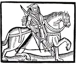 The early ballads are also quite clear on Robin Hood's social status: he is a yeoman. While the precise meaning of this term changed over time, including free retainers of an aristocrat and small landholders, it always referred to commoners. The essence of it in the present context was "neither a knight nor a peasant or 'husbonde' but something in between".[19] Artisans (such as millers) were among those regarded as 'yeomen' in the 14th century.[20] From the 16th century on, there were attempts to elevate Robin Hood to the nobility, such as in Richard Grafton's Chronicle at Large;[21] Anthony Munday presented him at the very end of the century as the Earl of Huntingdon in two extremely influential plays, as he is still commonly presented in modern times.[22]