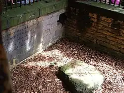 The gravestone now on this spot is surrounded by a low stone wall and fence. This is said to have been erected in the 19th century, to prevent local workers from carrying away pieces of the stone, which they believed to be a cure for toothache.[8] However, the stone may have been enclosed earlier than this.[14]