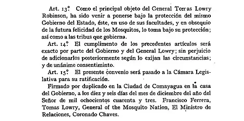 The Robinson–Chávez Treaty, formally titled the Treaty of Friendship, Alliance, and Mutual Protection, was a bilateral agreement signed on 16 December 1843 between the Kingdom of Mosquitia and the State of Honduras.[1] The treaty, consisting of 15 articles, was negotiated by General Thomas Lowry Robinson on behalf of Mosquitia and Coronado Chávez, the Minister of Foreign Affairs, for Honduras. It marked a rare instance of formal diplomatic engagement between an indigenous monarchy and a Central American republic during the 19th century.