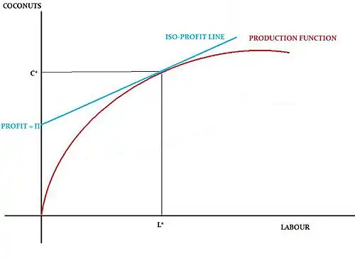 The above function describes iso-profit lines (the locus of combinations between labour and coconuts that produce a constant profit of Π). Profits can be maximised when the marginal product of labour equals the wage rate (marginal cost of production).[7] Symbolically,