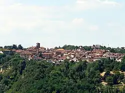Rocca Grimalda (Ra Roca in dialect) is a village and comune in the province of Alessandria, Piedmont, Northern Italy. It lies in Upper Montferrat, a historical region of Piedmont, and it was built upon a rocky hill on the Orba's left bank, very close to Ovada. The nearest airport is the Cristoforo Colombo Airport in Genoa.