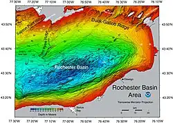 The Rochester Basin, at 802 feet (244 m), is the deepest part of Lake Ontario.[1] The lake bottom of the Rochester Basin is strongly marked by glaciation, with parallel gouges and underwater drumlins.[2][3]