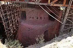 All 11 churches were the result of a process using the basic tools of hammers and chisels to excavate trenches surrounding the monolithic and semi-monolithic structures, as well as a system of tunnels which connected two separate groups of the churches with each other out of the scoriaceous basalt.[1][9] The "construction" was done from top to bottom.