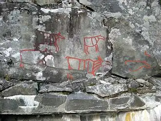 There are a total of 11 petroglyphs within a 4 square metres (43 sq ft) area on a cliff by the river. Seven of them could represent moose. The rest are more ambiguous, but are also likely to be moose. The carvings are narrow and shallow, with the largest being 45 centimetres (18 in) across.