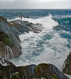 Rock fishing is fishing from rocky outcrops into the sea. It is a popular pastime in Australia[1][2] and New Zealand. It can be dangerous and many people have died as the result of it.[3][4][5] This may improve as more people who are rock fishing are beginning to wear life jackets.