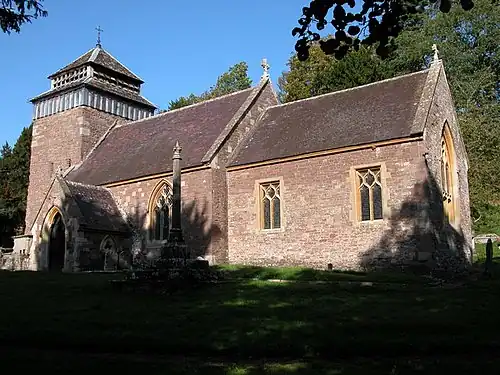 The church tower is mediaeval, but the rest of the church was rebuilt and refitted in 1859–60 by John Prichard and John Pollard Seddon in the Early English and Perpendicular styles. It contains a painted coat of arms of William III, dated 1700.[7]