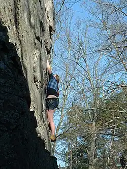 Rocktown, Georgia is the colloquial name for an outcropping of sandstone boulders on the Appalachian Plateau in northwest Georgia. It consists of several acres of large sandstone boulders; the average size is 30 to 40 feet (9.1 to 12.2 m) high. Every boulder has its unique features, all with great foot and hand holds, and are very popular with climbers. The area presents challenges for all levels of climbers. There is a one-mile hike from the trailhead to get to the Rocktown area. Most of these boulders are untainted by pollution and graffiti because it is in a remote part of northwest Georgia. However, in recent years as the climbing community has become increasingly aware of the area it has become more common to see trash, human waste, damaged or abandoned climbing gear, and vandalism. Because it is located in a wildlife management area, it is possible to encounter wild animals in this area, including both venomous and non-venomous snakes, bobcats, deer, wild turkeys, and black bears. When climbing and exploring the boulders, caves, and grottoes, it is common to encounter wasps, yellow-jackets spiders, and even the occasional bat. "Rock Town" refers to the large outcropping approximately one(1) mile from the trailhead. Which opens into a large gallery with 5 main pathways. This area has hundreds of spectacular formations, the entrance to a large cave, and 2 natural springs.