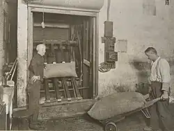 Packing department with barrels of Belgian cocoa in 1917 or 1918 -