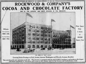 The original Brooklyn building is on the corner of Park Avenue and Washington Avenue, in the Wallabout neighborhood, which was a major industrial center at the time. It was initially constructed in 1890 for the Van Glahn Brothers grocer. Rockwood began leasing the space in 1904, having outgrown its Manhattan factory, and expanded gradually through the 1910s. It acquired the rest of the Van Glahn properties and erected new buildings, first northwards towards Flushing Avenue and then west towards Waverly Ave.[19] Among the new construction was a new factory on the northwest part of the block, on the corner of Waverly and Park. Parfitt Brothers designed it, with a showroom on the first floor designed by Ernest Flagg.[19]: 25 According to the Brooklyn Daily Eagle in 1910, it was the largest chocolate factory in the state and one of the largest in the country. It increased the total factory floor space to more than 125,000 square feet.[20]