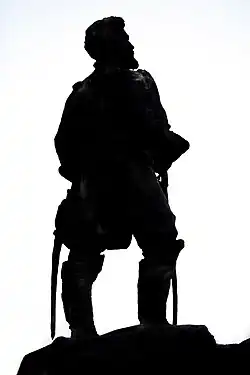 Ayoroa was at the forefront of the kinetic art movement in the mid-1950s. His paintings are filled with geometric elements and contrasts of warm and blue colors. His sculptures are made with Plexiglass bent into geometric shapes to look like perpetual motion. Ayoroa's art hangs in the Hirshhorn Museum and Sculpture Garden; the Library of Congress; National Museum of American Art; Smithsonian Institution; Museum of Modern Art of Latin America at the Organization of American States, Museum of Modern Art in Bogota, Colombia and National Museum of Fine Arts in La Paz, Bolivia.[3] During his time in Danville, he developed an interest in painting Civil War battle scenes and did many pictures of the Battle of Perryville.[4] He was commissioned by Lebanon to sculpt Confederate Major General John Hunt Morgan in 1999.[3] However, the statue of the Confederate general, who raided and destroyed parts of the town,[5] was never publicly displayed there. In 2015 the township put the statue out to bid.[6] In 1999 Ayoroa created the life-size sculpture of U.S. Army Major General George Henry Thomas, which was unveiled in Civil War Park, Lebanon, Kentucky, where it stands today.[7]