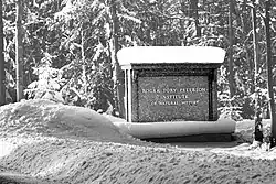 The Roger Tory Peterson Institute (RTPI) of Natural History in Jamestown, New York, launched in 1984, and ramped up its activity in 1986 with its hire of the first president, Dr. Harold D. Mahan.[21] At that time, the institute's primary mission was described as being "to develop programs to increase the number of serious students of natural history".[21] The institute's official ribbon-cutting and dedication took place in 1993.[22] The RTPI houses the largest collection of Peterson's work.[23] Its present mission and vision is stated as being to challenge visitors "to confront environmental issues of regional, national and global concern" and to be "a living embodiment of the Peterson Field Guide".[24]