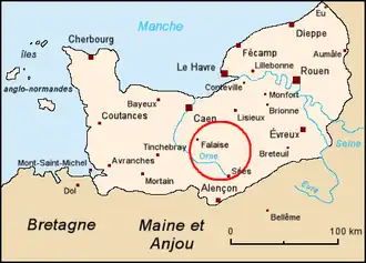 In 1035 at Robert I's death, his great uncle, Robert Archbishop of Rouen ruled Normandy as regent.[8] Roger seems to have lost favor with the young duke as well as his vicomte office as he signed an early charter of Duke William simply as Roger of Montgomery.[9] At the archbishop’s death in 1037, anarchy broke out in Normandy and among the rebels was Roger de Montgomery, formerly one of Duke Robert's closest companions, who, after being defeated in his own territory, fled to the court of Henry I of France.[10] Roger had been forced into exile by Osbern the Steward who was afterwards killed by William de Montgomery, Roger's son.[11] Roger died on February 7, 1055, in exile in Paris. In 1068 his wife was still holding lands at Bures and Saint-Pair.