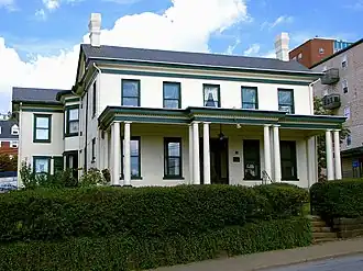 Rogers House is a historic home located at Morgantown, Monongalia County, West Virginia.[2] It was originally built about 1857 and is one of the last remaining residences from this time period in downtown Morgantown. The building is a two-story, five bay brick and wood frame dwelling in the Classical Revival style. The original section of the house is in brick, whereas the addition, designed by noted Morgantown architect Elmer F. Jacobs and built in 1905-1906 is wood frame. Jacobs is also responsible for the interior design. It sits on a rough-faced coursed ashlar stone foundation. It features a front porch with four sets of triple wooden, Tuscan order columns. It was the home of the Rogers family, pioneer settlers of Morgantown. It has been the home of West Virginia University's Campus Ministry Center since 1984. It was listed on the National Register of Historic Places in 1984. It is located in the Downtown Morgantown Historic District, listed in 1996.