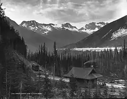 C.D. Morris,[109] who opened a store within a tent in 1901, erected a permanent store, boarding house and hall. Lodge, church, and public gatherings used this hall. In 1904, he added 15 or 16 bedrooms and a bathroom to the boarding house[110] to cater for the big summer demand from workers and tourists.[43] He was postmaster 1901–1903.[111] His store clerk, John O. Forbes,[112] and brother,[113] William B. Morris,[114] later filled the role. A 1910 fire destroyed this hotel/boarding house. The store was saved, but badly scorched.[115] The 1916 fire that destroyed the Morris store and residence[116] preceded the move to the new community of Glacier near the west portal. The school[117] similarly relocated.