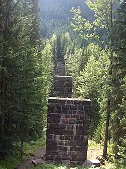One year after the tunnel opening, the right-of-way over the pass was handed over to the Parks Department for a wagon road, and the snow sheds were removed.[85] Some sections of the abandoned railway eventually became walking rail trails in Glacier National Park.