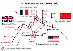 In January 1949, the Soviet side cut off the pneumatic post connections between the Soviet sector and the western sectors of Berlin at the sector borders (so-called pneumatic post blockade), thus aggravating the postal situation. As the Berlin pneumatic delivery network had historically been developed from the Haupttelegrafenamt Berlin, thus the centre of the entire network was now located in the Soviet sector.