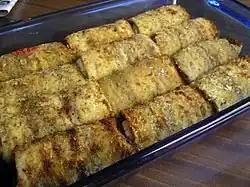 Rollatini (sometimes spelled rolatini or rolletini) or involtini is an Italian-style dish (called rollatini di melanzane in faux Italian) that is usually made with thin slices of eggplants, which are dusted in wheat flour or lightly breaded and covered with ricotta and often other cheeses and seasonings, then rolled up and baked. Alternatively, veal, chicken, or fish may be used in place of the eggplant.[1][2]