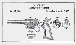 White left Colt's in December 1854. Within three months he had five patents, including Patent 12648 which was for an "Improvement in Repeating Fire-arms".[4][5] The next year, White signed an agreement granting Smith & Wesson the exclusive use of his patent for boring through the chambers, but not the rest of the patent. White retained a royalty rate of 25 cents for every revolver.[6]