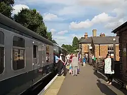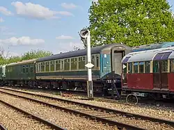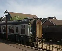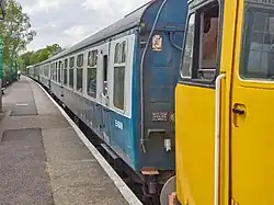 The railway has the two driving cars from what was a three-car Class 117 DMU. There were 127 of this type of vehicle and they were delivered new in 1959 to Southall depot working services between Paddington and the suburbs. They continued to be based in the London area until withdrawal in the 1990s, they arrived at the Railway in 2004. Each coach has two Leyland diesel engines underneath, which drive the wheels mechanically through a fluid flywheel. The driver's cab at each end of the unit means it can be driven from either end, making it ideal when running to Coopersale, and speeding up turn-around times. The windows in the ends mean passengers in either coach get an excellent view of the line ahead or behind and also get to watch the driver in action. The unit ran in an unusual dark blue and white 'EOR' livery until 2007, when it was taken out of service by the new owner when services were suspended. The interior has been refurbished, the unit is receiving attention to the exterior bodywork. DMBS is being restored; DMS is in service twinned with a Class 121 unpowered driving trailer.[16]