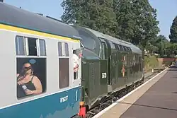 D7523 was built by British Railways at Derby in 1965 and started its career at Toton TMD before moving around various London Midland Region sheds such as Willesden, Longsight, and Crewe. It was renumbered 25173 in 1974.[12] It had been based at the Crewe Heritage Centre and on the West Somerset Railway.[13] It arrived at the railway on 7 September 2011 and will be used for engineering and ballast trains and for maintenance and testing of vacuum-braked coaches.[14] It is currently in BR Green, Undergoing heavy overhaul.[8]