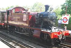 Large Prairie 4141 is a GWR 5101 Class locomotive. Built in 1946 it is a medium-sized tank engine with a 2-6-2T wheel arrangement and was designed for suburban and local passenger trains, often seen with GWR and BR suburban coaches. At time of purchase it had recently received a boiler certificate which would see it run for up to ten years, securing the position of steam when the two other residents' boiler tickets had expired.[2] Arrived at the Epping Ongar Railway in 2012, just in time for the "Santa Specials" in December 2012. It is out of service awaiting boiler repairs.