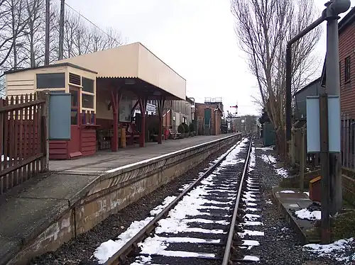 The station was originally opened as Tenterden but was renamed Rolvenden in 1903[1] when the current Tenterden Town station opened. The name Rolvenden is not really appropriate, the station is 2 miles from the village and is closer to Tenterden. When Colonel Stephens first opened the railway Rolvenden served as his locomotive workshop in a similar capacity to today. However the limited machinery and space meant during the 1930s it became harder to overhaul the line's ageing fleet. Most engines were sent to Ashford works to be overhauled. The locomotive shed and passenger station closed in 1954[2][3] and both were subsequently demolished. Freight services continued until 1961. After British Railways closed the railway the site of the original locomotive shed was sold for light industrial buildings.
