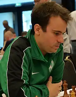 Amongst open tournaments, he won at Zaragoza 2008, Bad Wiessee 2008, Andorra 2009,[2] Echternach 2009 and 2010, Hastings 2009/10 and Clermont-Ferrand 2011. There have also been victories in closed events, at Grand Prix de Bordeaux 2007, Antwerp 2011 and Nancy 2012.[3] In August 2012, Édouard jointly won the French Chess Championship alongside Christian Bauer, Maxime Vachier-Lagrave and Etienne Bacrot.[4] In December of the same year, he won the Al Ain Classic tournament edging out Vachier-Lagrave on tiebreaks.[5] Édouard took part in the Grandmaster Group B of the Tata Steel Chess Tournament 2013 in Wijk aan Zee finishing sixth out of fourteen participants with a score of 7/13 points.[6] In 2014 he won the Dubai Open scoring 8/9, a full point ahead of the field.[7] Édouard tied for first in the 2015 World Open, held in Arlington.[8] In July 2015, he won the 3rd AIDEF Chess Championship (French-speaking countries chess championship) in Montreal.[9][10] He tied for first in the 2018 French Chess Championship with Tigran Gharamian and Yannick Gozzoli. Gharamian won the playoff.[11]