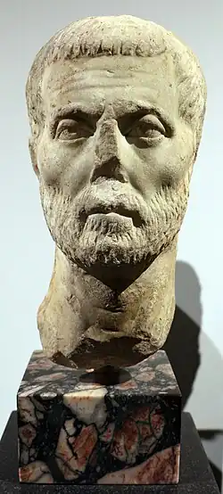 And while Aurelian was returning to the West, taking with him Zenobia and her son Vaballathus,[66] he received news that the inhabitants of Palmyra, under the leadership of a certain Apseus, had revolted, had killed the local governor, and had ingratiated themselves with the praefectus Mesopotamiae and rector Orientis of Mesopotamia (a certain Marcellinus), so that he himself would assume the imperial throne, in opposition to Aurelian. And since Marcellinus existed, they decided to proclaim as emperor a relative of Zenobia, a certain Achileus (or Antiochus).[67][68] Without delay Aurelian returned to quell the rebellion. Once he had restored order without fighting, he was harsh with the city of Palmyra: not only did he order the execution of the armed rebels but also of women, old people, children and farmers. The city was then destroyed, while Achilleus/Antiochus was left free, not even considering him worthy of punishment, so irrelevant was he.[69] He did however allow the surviving inhabitants to rebuild and inhabit the city.[70]