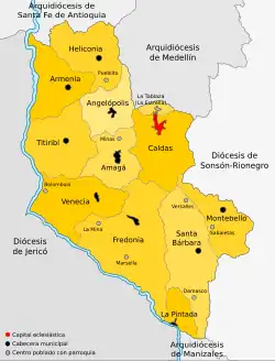 The Diocese of Caldas (Latin: Caldensis) is a Latin Church ecclesiastical territory or diocese in Colombia. The episcopal see is the city of Caldas. The Diocese of Caldas is a suffragan diocese in the ecclesiastical province of the metropolitan Archdiocese of Medellín. The Bishop of the Diocese of Caldas is Juan Fernando Franco Sánchez.