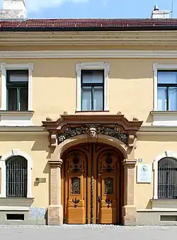 The Roman Catholic Episcopal Palace is one of the most representative baroques buildings in Timișoara, although some of the original details disappeared with the transformations and renovations from the late-19th century and afterwards.[15] From an architectural point of view, it is a building with a ground floor and a first floor whose façade is punctuated only by the simple rectangular windows. Remarkable is the baroque portal, with some rococo elements, which emphasizes the entrance to the building, on Pacha Street. The gate is provided with a rich decoration and a mascaron in the keystone, above it.[16] The building, at the four corners, had pavilion constructions protruding from the façade, reminiscent of the corner towers of castles, of which only two have been preserved, at the corners of Pacha Street.[15]